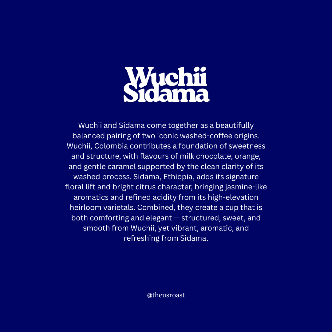 In a cup of Americano, the Wuchii × Sidama Washed Blend presents a bright yet comforting profile that showcases the harmony between Colombian structure and Ethiopian florality. The aroma opens with sweet orange, honey, and jasmine, supported by milk chocolate and a soft floral lift that brings elegance to the cup. The first sip reveals a smooth interplay of malic and citrus acidity — think jasmine brightness and orange zest — offering lift and clarity without sharpness.