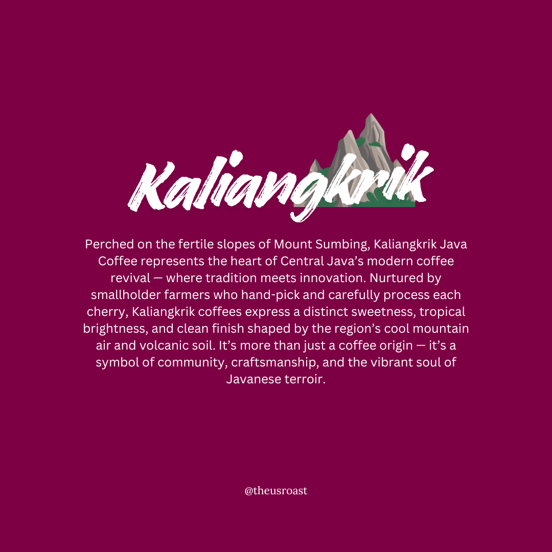 Perched on the fertile slopes of Mount Sumbing, Kaliangkrik Java Coffee represents the heart of Central Java’s modern coffee revival — where tradition meets innovation. Nurtured by smallholder farmers who hand-pick and carefully process each cherry, Kaliangkrik coffees express a distinct sweetness, tropical brightness, and clean finish shaped by the region’s cool mountain air and volcanic soil. It’s more than just a coffee origin — it’s a symbol of community, craftsmanship, and the vibrant soul of Javanese terroir.